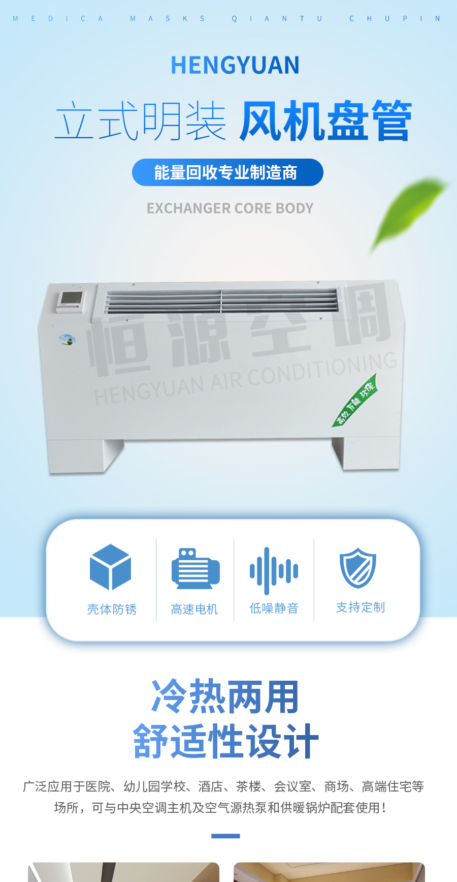 風機盤管機組簡稱風機盤管。它是由小型風機、電動機和盤管(空氣換熱器)等組成的空調系統末端裝置之一。盤管管內流過冷凍水或熱水時與管外空氣換熱,使空氣被冷卻,除濕或加熱來調節室內的空氣參數。它是常用的供冷、供熱末端裝置。